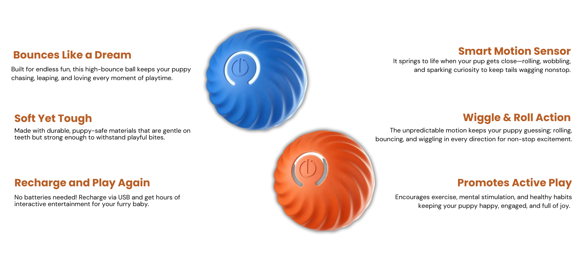 The Let’s Play Fetch! Puppy Ball helps your pup burn off extra energy through nonstop motion and excitement — no long walks required! It’s the fun, effortless way to keep tails wagging and zoomies in check.